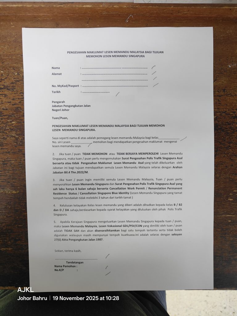 “PENGESAHAN MAKLUMAT LESEN MEMANDU MALAYSIA BAGI TUJUAN MEMOHON LESEN MEMANDU SINGAPURA.”